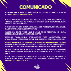 “Conversamos muito com as bandas e todas apoiam nossa decisão. Estamos convencidos de que o momento é de prudência e que logo mais estaremos todos juntos no João Rock em setembro”, explica o organizador, Marcelo Rocci.