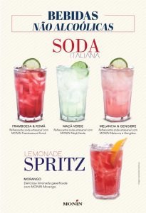 Entre os não-alcoólicos estão o Lemonade Spritz Morango, limonada gaseificada com Monin morango, e as sodas italianas artesanais Framboesa & Romã, Maçã-verde e Melancia & Gengibre, aromatizados com Monin.