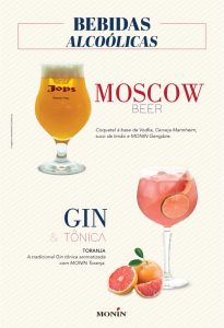 Entre os com álcool estão o Moscow Draft Beer, coquetel com chopp Pilsen puro malte Mannheim, fabricado pela Cervejaria JOPS, vodka, suco de limão e Monin gengibre e o Gim&Tônica Toranja, coquetel com toques cítricos e picantes aromatizado com Monin toranja.