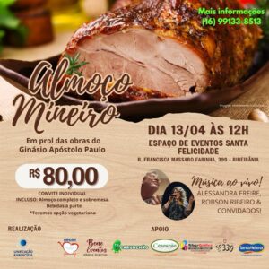 Para viabilizar a recuperação do edifício do Ginásio e Centro Cultural Apóstolo Paulo, a Unificação Kardecista de Ribeirão Preto promove mais uma edição do Almoço Mineiro, no dia 13 de abril (domingo), às 12h, no Espaço de Eventos Santa Felicidade (Rua Francisca Massaro Farinha, 39, Ribeirânia).